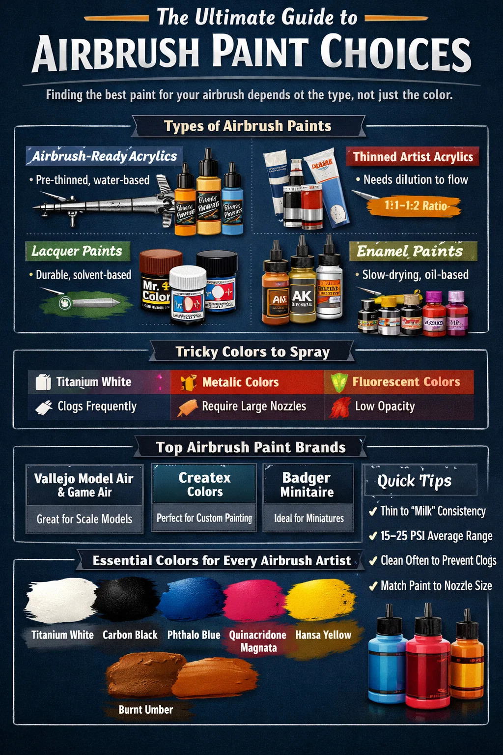 Før du dykker ned i specifikke nuancer, er det vigtigt at forstå, at en airbrush ikke skelner mellem rød og blå - den skelner mellem maling, der flyder, og maling, der tilstopper. Mediet (malingstypen) er den største faktor i airbrush-ydelsen. Her er en oversigt over hovedkategorierne:
