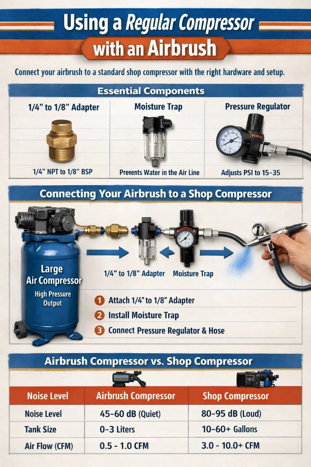 Standard butikskompressorer har normalt 1/4-tommer NPT (National Pipe Thread) fittings, hvorimod den typiske airbrush slange bruger en meget mindre 1/8-tommer BSP (britisk standardrør) trådning. For at bygge bro over dette hul skal du bruge specifik konverteringshardware.