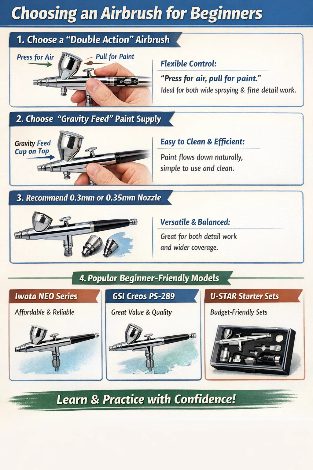 For begyndere, der lige er startet med airbrushing , holdbarhed, nem rengøring og brugervenlighed er de vigtigste kriterier, når de skal vælge deres første værktøj. Du behøver ikke at sigte efter de dyreste professionelle modeller, men du bør absolut undgå billigt fremstillede produkter for at forhindre frustration.