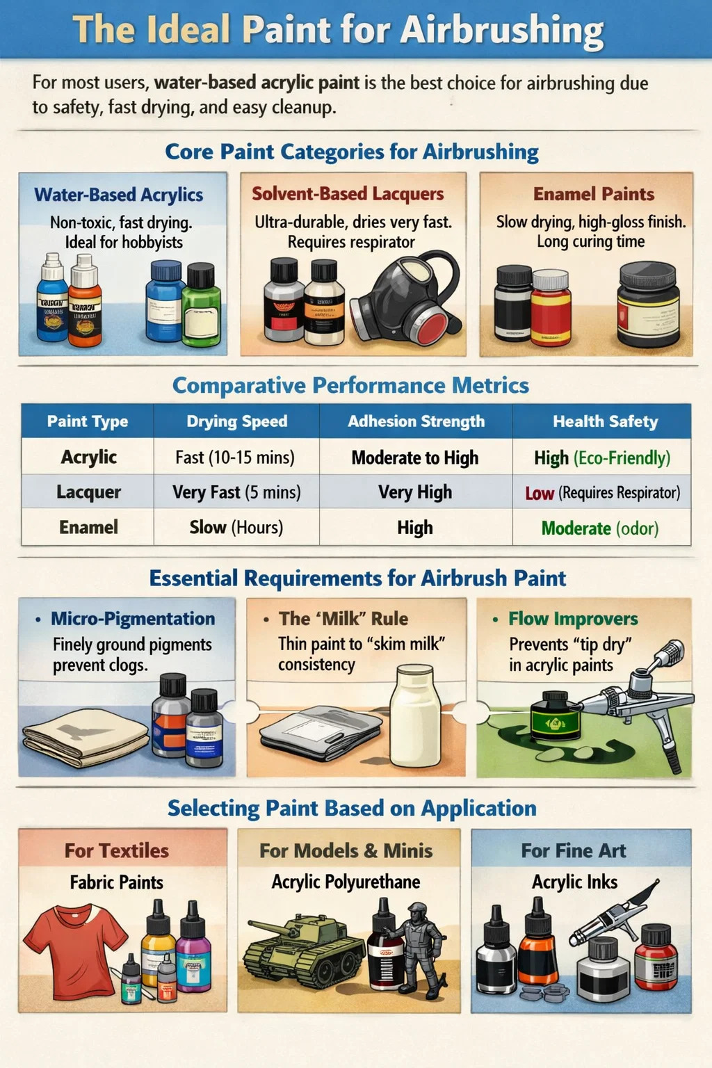 For langt de fleste brugere, vandbaseret akrylmaling er det bedste valg til airbrushing. Det giver en optimal balance af ikke-giftig sikkerhed, hurtige tørretider og nem rengøring med simpelt vand eller specialiserede rengøringsmidler. Mens avancerede hobbyfolk kan bruge lakker for ekstrem holdbarhed, akryl er industristandarden til generel illustration, skalamodellering og tekstilarbejde på grund af deres alsidighed på tværs af forskellige overflader og minimal kemisk lugt.